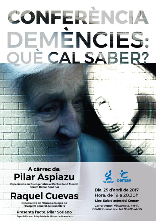 El proper dimarts 25 d’abril de 19 a 20.30h hi haurà una conferència de “Demències, què cal saber?” a la Sala d’actes del Cemav.