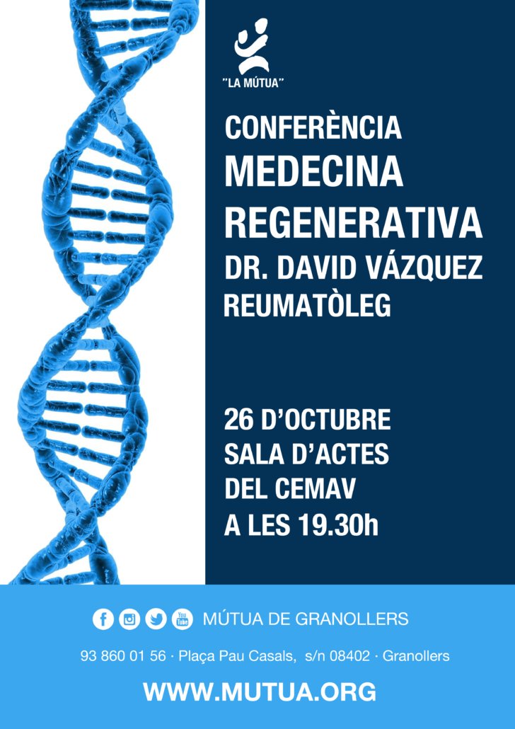 El dijous 26 d’octubre a les 19.30h, el Dr. David Vázquez, metge especialista en Reumatologia del CEMAV, donarà una conferencia sobre Medecina Regenerativa i Plasma Ric en Plaquetes.