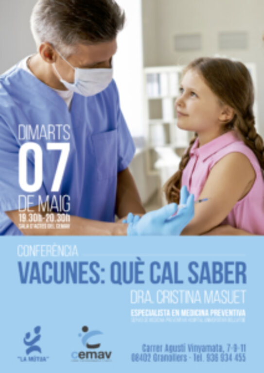 El proper 7 de maig de 19.30 a 20.30 h, la Dra. Cristina Masuet, especialista en Medicina Preventiva a l’hospital universitari Bellvitge, donarà una conferència sobre el que cal saber de les vacunes.