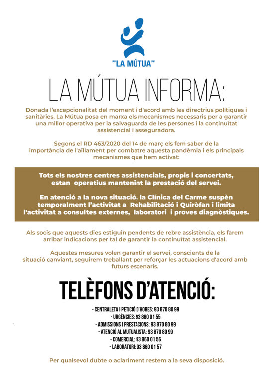 Donada l’excepcionalitat del moment i d’acord amb les directrius polítiques i sanitàries, els informem que La Mútua ha procedit a posar en marxa els mecanismes necessaris per a garantir una millor operativa tenint en compte la salvaguarda de les persones i la continuïtat assistencial i asseguradora.
